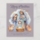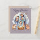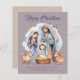 Tarjeta de Navidad Feliz Presupuesto Mono Nacimiento. Una tarjeta de presupuesto más pequeña de 4,5" x 5,6" con brillo semi, similar en grosor a una postal. Una escena del Nacimiento adorable en tonos pastel suaves de cremas, caramelo y púrpura difuso. Fácilmente con sus saludos y nombres en ambos lados.