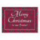 Una tarjeta de Navidad elegante y festiva para un pastor, con por todas partes un modelo de chucherías y de estrellas en rojo y verde con las letras intrépidas, blancas.