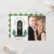 Con un clásico porche delantero decorado para las fiestas, con árboles de Navidad coronados por estrellas que flanquean la elegante puerta negra, una corona de pino con lazo de gingham rosa y linternas coronadas con rosas y acebo. Al estilo de Magnolia | granja moderna | clásico elegante. 3 COLORES DE PLAID PARA LA PARTE TRASERA ESTÁN EN EL DISEÑO (verde oscuro como se muestra, negro o rosa - simplemente edite y oculte las imágenes que no desee). ¡Agregue el retrato de su familia para un saludo personalizado de vacaciones!