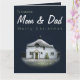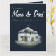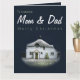 Tarjeta de Navidad tradicional para una Mamá y Papá especiales. Cabaña inglesa en la nieve.