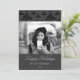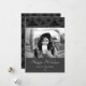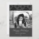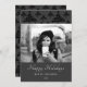 Tarjeta de foto de vacaciones de Navidad elegante y moderna. La tarjeta tiene un esquema de color gris y negro - con foto, deseo de Felices Fiestas, nota personal y número de año en letra cursiva blanca de moda. El patrón de árbol de Navidad abstracto negro está en la parte delantera y trasera de la tarjeta. Inserte su foto favorita en la plantilla - la foto en blanco y negro combina muy bien con el diseño. Personalice esta tarjeta con su nombre y número de año. Es un gran diseño para cualquier persona, especialmente para personas solteras.