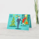 Esta tarjeta de Navidad retra de los pares del dibujo animado del día de fiesta le pondrá en el alcohol del día de fiesta. Las características del diseño delanteras un fondo de la turquesa con ladrillos verde azulados y un verde verde oliva, chimenea del cono. Hay un trullo, reloj de pared del starburst y una lámpara pendiente de dos niveles en sombras de amarillo, del azul y del negro. Un árbol de navidad verde se adorna con una estrella amarilla y los ornamentos del trullo. Frente y centro, hay un hombre de negocios distinguido, de martini-swilling en un juego azul y un lazo anaranjado. A su lado, su bomba rubia de una esposa del trofeo está llevando un vestido rojo del meneo y un gorra de Santa mientras que sostiene una bandeja de martinis. El interior de la tarjeta ofrece un fondo de la turquesa con dos starbursts del vintage que rodean las palabras, "buenas fiestas." ¡Fa-la-la-di-DA!
