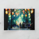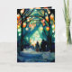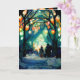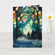 Esta tarjeta de Navidad presenta una reunión nocturna en un bosque nevado entre los árboles con luces brillantes en lo alto. El arte es acuarela ayudada por inteligencia artificial y estilizado al estilo de Alphonse Mucha.