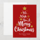 Te deseamos una Feliz Navidad en fuente de estilo script en una tarjeta de Navidad roja con forma de árbol. Puedes cambiar el color del fondo y también del gráfico de texto principal y las estrellas y copos de nieve por separado, así como el nombre de la familia y el texto del año.