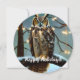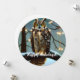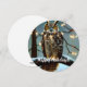 Hermosa y única tarjeta de Navidad redonda que presenta un diseño de Navidad de arte digital generado por IA de un búho de cuernos grandes posado en una rama cubierta de nieve con luces blancas en los árboles y un fondo de cielo estrellado. El saludo "Felices Fiestas" se puede personalizar a uno de su elección
