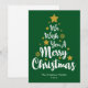 Te deseamos una Feliz Navidad en fuente de estilo script en una tarjeta de Navidad verde con forma de árbol. Puedes cambiar el color del fondo y también del gráfico de texto principal y las estrellas y copos de nieve por separado, así como el nombre de la familia y el texto del año.