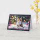 Esta tarjeta de Navidades festividades exhibe a un gatito calico irresistiblemente lindo sentado en un maravilloso y nevado invierno. El gatito, con sus ojos brillantes y su suave piel multicolor, está rodeado de brillantes lámparas de árbol de Navidad y adornos coloridos, lo que crea un ambiente mágico de vacaciones. Una delicada frontera con marcos rosas realza la carta, mientras que el alegre saludo "Feliz Navidad" está elegantemente escrito en el fondo. Perfecto para los amantes de los gatos y para aquellos que disfrutan de un toque de fantasía durante las vacaciones.
