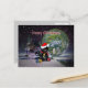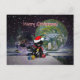 Una tarjeta diferente de Feliz Navidad con un lindo gato usando un sombrero de Papá Noel en un ambiente nevado surrealista.