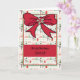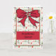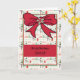 Tarjeta de navidades para niños con elfos pequeños, un gran arco rojo y bordes rojos y verdes. Gracias a Creative Fabrica por algunos de los elementos del diseño.