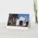 Una hermosa vista de una pequeña iglesia blanca impresa en una tarjeta de Navidades dejada en blanco dentro para tu propio mensaje personal.