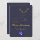 Elegante tarjeta de bienvenida de Navidades de color azul oscuro de pizarra azul oscuro, con un purpurina dorado que parece ciervo estilizado, en la mitad superior de la tarjeta. Purpurina dorado luce texto gráfico leyendo Feliz Navidad, decora la mitad inferior de la tarjeta Tan personalizado texto listo para personalizar con el nombre de su empresa y un área de logotipo está lista para reemplazarlo con el logo de su empresa.