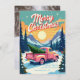 Envíe alegres deseos de vacaciones con esta fantástica tarjeta de Navidades que incluye una camioneta rosa vintage llevando un árbol fresco a través de un paisaje montañoso nevado. Con colores retro audaces, estilo de mediados de siglo, y espacio para personalizar tu nombre y mensaje familiar, esta carta festiva es perfecta para los que aman diseños únicos y coloridos de vacaciones con un toque nostálgico. Una opción destacada para difundir la alegría con un toque de personalidad.