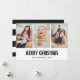 Foto en blanco y negro de la tarjeta navideña Merry con rayas blancas y negras con la nieve cayendo de oro en la parte de atrás. Personalice fácilmente esta tarjeta de vacaciones de collage de fotos con sus fotos y texto.