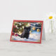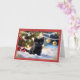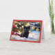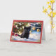 En la parte delantera de esta tarjeta de Navidades hay un gatito negro adorable sentado en la nieve, rodeado de adornos festivos. El gatito tiene una expresión inquisitiva, con sus ojos brillantes que le dan un toque de alegría y encanto al lugar. Detrás del gatito, brillantes lámparas de Navidad y baudibles colgados iluminan suavemente un árbol de Navidad borroso, añadiendo un cálido ambiente de vacaciones. El fondo rojo de la tarjeta está bordeado por intrincados diseños dorados, con delicados motivos florales en las esquinas que le dan a la tarjeta un toque elegante y festivo. Las palabras "Feliz Navidad" están escritas en un sofisticado guión negro y dorado en la parte superior, lo que proporciona un cálido saludo de vacaciones. Esta tarjeta es perfecta para los amantes de los animales y para aquellos que aprecian imágenes bonitas y festivas. Capta el espíritu alegre y lúdico de la temporada de vacaciones con una mezcla de elegancia y capricho. Ideal para enviar los más sentidos deseos de los Navidades con un toque de cortesía.