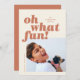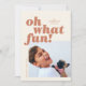 Esta tarjeta de vacaciones incluye un audaz mensaje "oh qué divertido" y colores modernos para una versión actualizada de la tarjeta de vacaciones tradicional. Añade un mensaje más largo y una foto adicional a la parte posterior si quieres.