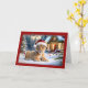 La parte delantera de esta tarjeta de Navidades tiene una encantadora imagen de un joven cachorro de león tirado en la nieve, usando un festivo sombrero de Santa. El club mira hacia adelante con una expresión curiosa e inocente, rodeado de decoraciones navideñas. Al fondo, una acogedora cabaña está decorada con Navidades, luces y coronas enmarcadas por árboles nevados, lo que le confiere al lugar una pintoresca atmósfera de tierra maravillosa. El texto "Feliz Navidad" se muestra en la parte superior con un elegante y clásico tipo de letra, añadiendo al espíritu festivo. El borde de la tarjeta es un rojo profundo, realzando el ambiente festivo y haciendo que la imagen destaque aún más. Esta tarjeta sería perfecta para los amantes de los animales y para aquellos que disfrutan de una diversión y reconfortante toma de las tarjetas de vacaciones tradicionales. Transmite un mensaje de calidez, alegría y la maravilla de los Navidades salvajes.
