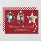Festividad de Navidades de fotografía personalizados rojos tarjetas de felicitación hechas en estilo plano, con tres áreas de imagen enmarcadas en blanco en forma de adornos. Un divertido bastón de caramelo rojo y blanco parece colgar del saludo de Feliz Navidad. Personalice con sus imágenes y texto.