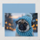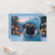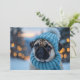 Esta adorable tarjeta de Navidades incluye un lindo pug con un gorra y bufanda de tejido azul acogedor, que posan sobre un telón de fondo de luces brillantes y un paisaje nevado. Esta imagen reconfortante es perfecta para difundir alegría por las vacaciones y para traer una sonrisa a los rostros de los amantes del perro y de los Navidades entusiastas por igual.