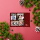 El diseño frontal incluye cuatro de sus fotos, cada una enmarcada en un hermoso borde de Relieve metalizado. A la derecha se muestran los deseos de sus Navidades, también en el mismo Relieve metalizado encantador. En la parte posterior se muestra la foto de tamaño completo, con el texto del personalizable debajo. El fondo es de un bonito borgoña.