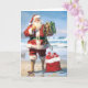 Una playa tropical vibrante con un cielo azul claro. Las arenas doradas se extienden hasta el infinito y se mezclan con las aguas cristalinas del océano. En primer plano, Santa Claus aparece pintado con su atuendo tradicional. Santa está descalzo y se ha puesto los pantalones para caminar por las aguas poco profundas de la orilla. Está sosteniendo un gran saco de falda lleno de juguetes coloridos sobre su hombro. Las mejillas rosadas de Santa y su expresión alegre indican que está disfrutando plenamente de su tiempo en la playa. El diseño capta el espíritu caprichoso y divertido de la temporada navideña, con un giro único en la imagen tradicional de Santa Claus, convirtiéndolo en una tarjeta de saludo memorable y reconfortante para quien la reciba.