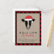 Tarjeta rústica para Navidades de la granja de vacas - con una vaca con un sombrero de Santa Hat en un fondo rústico de Kraft, rodeada de mantas de búfalo rojas y negras. La parte posterior de la tarjeta postal incluye un área para la dirección de retorno, un saludo de Navidades y un área para la dirección del destinatario. Se incluye un código QR que lleva a la dirección de su negocio, una forma muy conveniente para que sus clientes encuentren su sitio web. Todo el texto se puede editar.