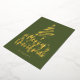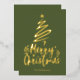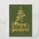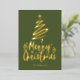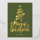 Relieve metalizado dorado verde oliva oscuro Feliz Navidad estilo de escritura decorativa con un contorno de un árbol de Navidad y una estrella encima. Esta tarjeta de Navidad está diseñada para que puedas cambiar el color del fondo e introducir también el nombre de tu familia.