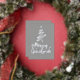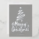 Fondo gris con Relieve metalizado plateado Feliz Navidad estilo de escritura decorativa con un contorno de un árbol navideño y estrella en la parte superior. Esta tarjeta de Navidad está diseñada para que puedas cambiar el color del fondo e introducir también el nombre de tu familia.