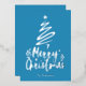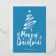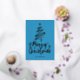 Fondo azul con Relieve metalizado plateado Feliz Navidad estilo de escritura decorativa con un contorno de un árbol de Navidad y estrella en la parte superior. Esta tarjeta de Navidad está diseñada para que puedas cambiar el color del fondo e introducir también el nombre de tu familia.
