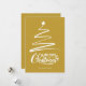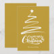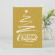 Feliz Navidad con el tipo de letra del guión con un contorno de un árbol de Navidad y una estrella en el diseño superior. Esta tarjeta de Navidades de color de fondo dorado está diseñada para que pueda cambiar el color del fondo y también introducir su nombre familiar.