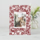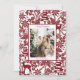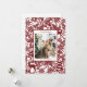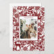 La escena de un bosque en invierno es el tema de esta carta de Navidades. El diseño presenta vegetación forestal como pinares, árboles cubiertos de nieve, flores y ciervos. La foto de tus Navidades se sentará en el centro de la tarjeta rodeada por el diseño rojo y blanco.
