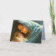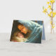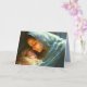 Tarjeta de Navidades Madre y Canción - La madre virgen sostiene a su hijo pequeño, Jesús, en esa noche sagrada. Los colores son azul claro y crema con un toque gris.