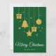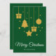 Feliz Navidad en un lujoso tipo de caligrafía con arbol colgante de Navidad, regalos, estrellas y Navidades diseño bauble. Esta tarjeta de Navidades de color de fondo verde está diseñada para que pueda cambiar el color del fondo y también introducir su nombre familiar o quitarlo si desea tener el diseño sin la línea de apellido.