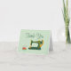Carta de agradecimiento a la costura de dulces hecha en verde claro, con gráficos caprichosos de una máquina de coser de estilo antiguo verde y dorado y cojín de alfiler. Personalice todo el texto para que se ajuste a sus necesidades.