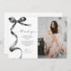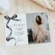 Expresa tu gratitud con estilo con esta elegante tarjeta de agradecimiento en negro y blanco, que presenta un moderno lazo negro y espacio para una foto personal. Perfecta para cumpleaños, despedidas de soltera o cualquier ocasión especial, este diseño emana sofisticación atemporal. Personaliza con tu mensaje sincero y detalles para crear un recuerdo memorable para tus destinatarios.