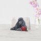 Esta tarjeta de nota muestra una reproducción de mi pintura original de aceite de un perro caniche negro con una bola roja.