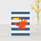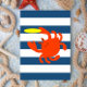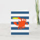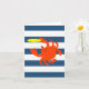 Esta tarjeta de nota en blanco muestra un poco de capricho náutico con franjas navales y un cangrejo dando un salto a una frisbea voladora alta.