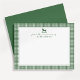Una encantadora tarjeta de notas de gingham verde para un bebé, que incluye un delicado ilustracion de caballo y texto de personalizable. Perfecto para notas de agradecimiento, correspondencia personal o papelería infantil, este diseño atemporal combina un patrón clásico de comprobación azul con detalles elegantes. Un bello recuerdo y una manera cuidadosa de enviar mensajes cálidos a sus seres queridos.