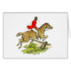 Tarjeta de apunte para montar a caballo de Fox Hunt Hunter Jumper. Cuenta con un jinete vestido con atuendo ecuestre completo con chaqueta roja y gorra negro y botas. El jinete está a caballo, saltando una valla de madera, posiblemente en una cacería de zorros. Cabalgatas, imagen ecuestre. Para cualquier cazador de zorros, ecuestre, criador o amante de los caballos. Más productos de esta imagen en la categoría de equitación de Hunter Jumper de mi tienda.