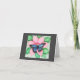 Tarjeta de nota con diseño de mariposa azul hecho en lápiz de policolor y grafito y un verso inspirador.