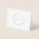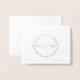 La tarjeta de nota de agradecimiento al Relieve metalizado plateado real se muestra en blanco con un nombre de muestra y un borde y una huella de acento en Relieve metalizado plateado real. Personalizar esta tarjeta y cambia el texto de ejemplo al tuyo con esta plantilla o compra como se muestra.