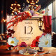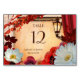 Tarjeta de número de mesa con un diseño romántico con flores de anemona y gerbera margarita en un estilo clásico italiano o mediterráneo inspirado con hojas de otoño coloridas y luz de linterna cálida. Aunque está preparada para una boda, esta tarjeta se puede utilizar para cualquier celebración de otoño, como un cumpleaños, jubilación o Día de Acción de Gracias...