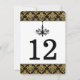Esta elegante tarjeta de número de mesa con patrón de damasco dorado y negro sobre un candelabro formal de salón de baile de doble cara tiene un borde de damasco dorado FAUX victoriano barroco que coincide con la invitación de aniversario de bodas número 50 que se muestra a continuación. Todo el texto es personalizable, y también lo son las opciones de papel. ****TENGA EN CUENTA que el papel dorado metálico es un oro muy oscuro y bronceado y alterará severamente los colores del diseño, por lo que NO sugiero usar ese papel. Se muestra aquí en papel básico, pero brillaría extrañamente en papel de hielo metálico, que tiene un sutil brillo opalescente. El papel de fieltro es un papel grueso y texturizado que también daría resultados lujosos. El lino enfriará el diseño y es un papel ligero con líneas delgadas que lo atraviesan. El papel delicado es MUY delgado y semitransparente como el vellum, por lo que no sugiero pedir ese ni el papel acanalado. TAMBIÉN, si cambia las fuentes o los tamaños de fuente, es posible que su texto ya no quepa correctamente. Zazzle no editará nada para errores tipográficos, alineación o cualquier otra cosa, y no veré su invitación. Todo se imprimirá