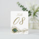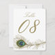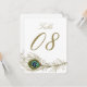 Tarjeta de número de mesa con pluma de pavo real caprichosa