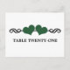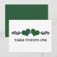 Dulce y caprichosa Tarjeta de número de mesa de boda Corazones Elegantes con un borde de voluta elegante adornado con un par de corazones esmeralda verdes. Esta tarjeta de mesa moderna es la elección perfecta para una boda chic y elegante. Fácil de personalizar, simplemente agregue el número(s) de mesa apropiado(s) en el campo de texto proporcionado. Haga clic en "Personalizar" para encontrar opciones de personalización adicionales.