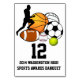 Tarjeta numérica de evento deportivo hecha en blanco, con gráficos de un corredor de pista, fútbol, voleibol, fútbol, baloncesto, baloncesto, béisbol y tenis. El número negro y el texto de la parte inferior están listos para personalizar para leer lo que desee. Personalice el número y el texto, uno para cada tabla en su evento. El color de fondo puede cambiarse fácilmente a cualquier color que desee en modo personalizar.