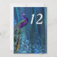 Tarjeta elegante de número de mesa para recepción de boda, con gráficos de un fondo de aspecto de satén de color azul turquesa rico, con un floreo azul y un pavo real colorido. Personalice el número blanco y el tamaño que desee para la tarjeta, para cada mesa en su recepción. Productos coincidentes disponibles.