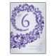 Esta tarjeta de número de mesa de boda está diseñada con un marco ornamentado elegante y decorativo hecho de patrones intrincados de damasco en tonos de púrpura y lavanda. El diseño de damasco giratorio forma un borde circular, que encierra elegantemente el gran número de mesa en el centro. La tipografía equilibra la claridad moderna con un toque de refinamiento, mientras que la palabra "Mesa" está estilizada en escritura fluida para mejorar el aspecto romántico y formal.
