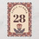 "Eleva la decoración de tu recepción con estos elegantes números de mesa para boda, que presentan un sofisticado motivo floral de vidrio tintado Art Deco. Los tonos cálidos y terrosos de terracota y malva ofrecen un perfecto estilo retro-moderno para tu decoración de mesa. El patrón de fondo es 100% ajustable en color, lo que te permite personalizar fácilmente los tonos para que coincidan con las flores y telas de tu boda. Una forma hermosa y práctica de guiar a tus invitados con estilo."