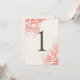 Tarjeta de número de mesa de coral ombre personalizable elegante con una hermosa impresión floral. Colección creada por Colourful Designs Inc. Copyright 2013.