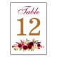 Esta sencilla y asequible tarjeta reversible de número de mesa de boda tiene una paleta de colores audaces de burgundy, dorado, rojo, púrpura, naranja, verde, crema y rosa con flores surtidas, follaje, plumas y vegetación en la parte inferior. La palabra Mesa aparece en burgundy en la parte superior y el número de mesa personalizable es de color dorado oscuro. DEBE cambiar el número 12 a cada número que necesite, agregarlo al carrito y luego regresar y hacer lo mismo para todos los números de mesa que necesite. Zazzle no hace secuencias, por lo que debe tener tarjetas numeradas individualmente en su carrito para todas las mesas.